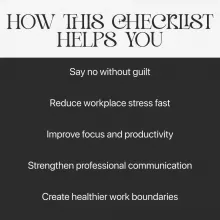 This downloadable checklist is crafted to guide you step-by-step through building healthy workplace boundaries without damaging professional relationships. It blends reflection, action planning, and real-life practice into one simple resource.
