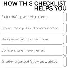 Unlike generic email-writing templates, AI Email Mastery is a guided checklist that teaches you how to think, plan, and communicate more effectively using a smart blend of structure and AI tools. It empowers you with adaptable strategies rather than rigid scripts, giving you confidence in every message you write.