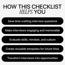 This digital download is perfect for hiring managers, startup founders, recruiters, and anyone looking to streamline their interview process. If you want to create memorable interviews that attract top talent, save time, and leverage AI for smarter hiring, this guide, eBook, and checklist is your ultimate toolkit.