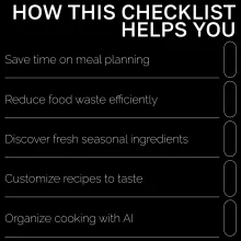 This checklist is perfect for home cooks of all skill levels who want to embrace seasonal eating, save time, and enjoy more creative meals. It’s especially ideal for those who want to combine technology with cooking, experiment with flavors, and keep their kitchen organized and efficient.