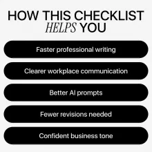 This digital checklist is perfect for professionals, managers, freelancers, remote workers, and anyone who writes at work and wants better results with less effort. No technical or AI experience is required.