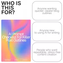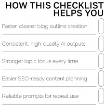 Unlike generic writing guides, this checklist is built specifically for crafting strategic ai prompts for blog post outlines. It focuses on clarity, structure, and creative direction—giving you a repeatable method that makes your AI tools produce content that feels polished, human, and aligned with your goals. It’s simple, actionable, and designed for real-world content workflows.