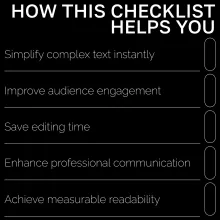 Unlike other digital resources, this checklist combines actionable guidance with AI-powered solutions, giving you a practical, step-by-step approach to making your content shine. It’s concise, easy to follow, and specifically focused on enhancing readability without sacrificing your unique voice.