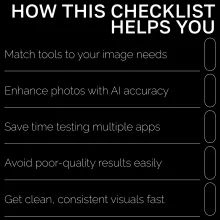 Unlike generic tool lists, the Checklist: AI Tools for Image Cleanup gives you a structured, actionable system for evaluating features, testing performance, and choosing what really works. It’s clear, concise, and built to save you time while helping you get studio-quality results with minimal effort.