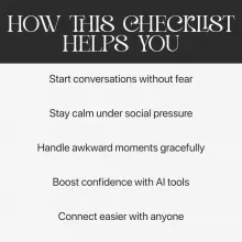 This checklist covers four powerful sections: preparing your mindset and body, navigating conversations smoothly, handling social anxiety in the moment, and using AI to strengthen your social skills in a practical, modern way.