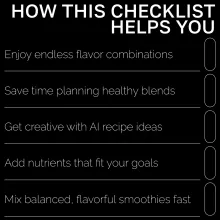 Ideal for smoothie lovers, fitness fans, busy individuals, and anyone using AI tools to simplify healthy living. Whether you’re fueling your morning or winding down with something sweet, this checklist helps you craft the perfect blend every time.