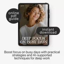 Struggling to concentrate when your to-do list is overflowing? Deep Focus on Busy Days is the guide you need to reclaim your attention and work smarter, not harder. Packed with actionable strategies, this digital download teaches you how to build deep work focus during busy days, overcome distractions, and maximize your productivity—even when life feels overwhelming.