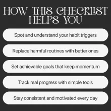 This checklist is perfect for anyone who wants to improve their daily habits, boost productivity, or simply feel more in control of their life. Whether you’re trying to stop procrastinating, eat better, or create healthier routines, this guide helps you do it with ease and motivation.