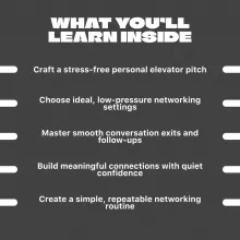 Whether you’re just starting out or looking to grow your existing network, this downloadable guide helps you navigate the world of networking without forcing you to become someone you’re not. Discover the power of quiet confidence, intentional conversations, and connection over charisma.