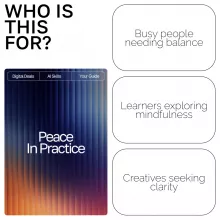 This guide is perfect for anyone new to mindfulness who wants to feel calmer, think clearer, and use technology more intentionally. Whether you’re balancing work, studies, or home life, Peace in Practice helps you integrate short, effective practices into your daily routine—no prior experience needed.