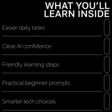 - Next Steps for Confident AI Use: Small daily habits that build skills, how to choose the right AI tools, and a quick checklist for ongoing learning.