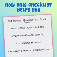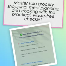 Unlike generic meal planners or budgeting spreadsheets, this checklist is tailored specifically to the solo eater. It focuses on realistic eating patterns, flexible spending habits, and the actual challenges of cooking for one (yes, including takeout temptations). It’s the only resource that teaches how to budget groceries for 1 while keeping things practical, fun, and totally doable.