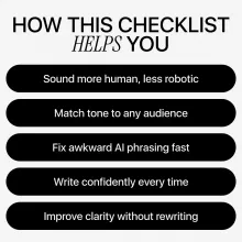This resource is perfect for content creators, marketers, freelancers, small business owners, and anyone using AI tools who wants better control over tone. If you’ve ever struggled to make AI sound human—or human writing sound polished—this checklist was made for you.