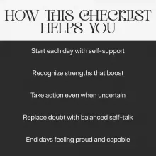 This checklist is for anyone ready to build lasting confidence through gentle, consistent practice. Whether you’re pursuing goals, managing self-doubt, or simply wanting to reconnect with your strengths, The Daily Self-Belief Strengthener gives you clear, achievable steps to grow your trust in yourself every single day.
