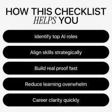 Unlike generic AI guides, this checklist focuses on decision-making, positioning, and proof. You are not just learning about AI, you are choosing a target role, mapping skills to business outcomes, and creating tangible examples you can show employers or clients.