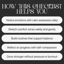 Unlike quick-fix guides, this checklist honors the slow process of emotional growth. It focuses on consistency and kindness over intensity, reminding you that small, repeated actions are what create lasting change. Each exercise helps you meet yourself where you are and gently strengthen from there—because true resilience grows quietly, not urgently.