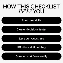 Unlike generic AI guides, this checklist focuses on balance, clarity, and sustainability. It doesn’t push more hustle—it helps you create a healthier, more efficient workday with tech as a supportive partner.