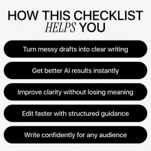 This checklist is ideal for writers, creators, students, marketers, business owners, and busy professionals who want clearer writing without overthinking the process. It’s especially helpful if you already use AI tools but feel like your results are inconsistent or “almost right.”