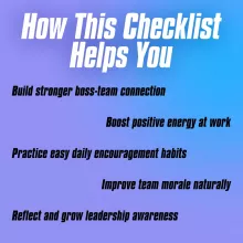 If you’ve ever wondered how to create a more uplifting work environment, it starts with you. Your Daily Encouragement Action Checklist makes it easy, doable, and genuinely rewarding. Whether you’re looking to improve communication, earn more trust, or just brighten your boss’s day, this checklist is a small tool with big impact.
